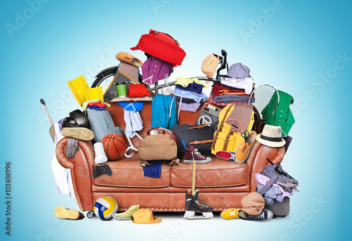 © Zarya Maxim, Naklejka premium Large leather sofa with a bunch of different things