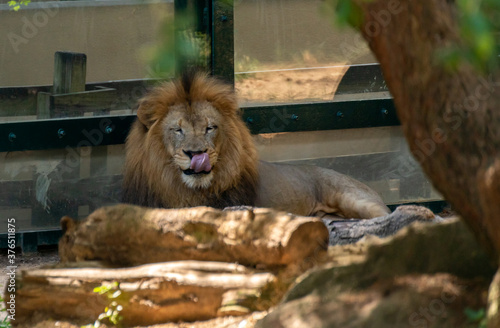 Naklejka premium Large Lion With Pink Tongue out with Zoo By Glass