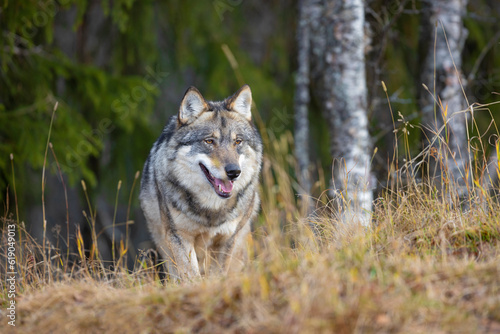 © kjekol, Naklejka premium Large male grey wolf walking in the forest
