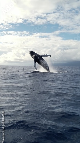 Fototapeta premium Large marine mammal breaches, ocean, cloudy sky.