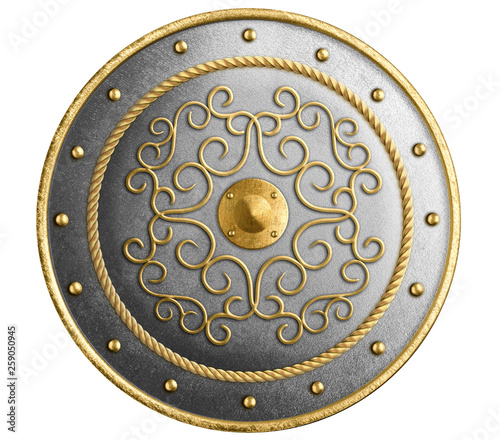 © Andrey Kuzmin, Fototapeta premium Large metal round shield decorated gold isolated 3d illustration