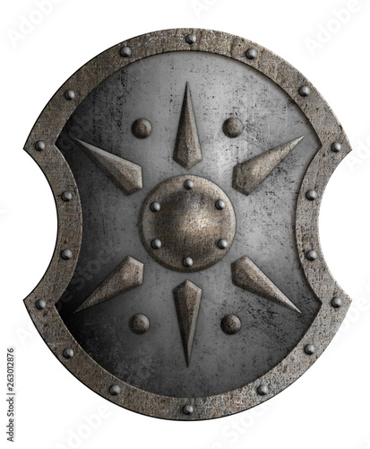 © Andrey Kuzmin, Naklejka premium Large metal shield with star isolated 3d illustration