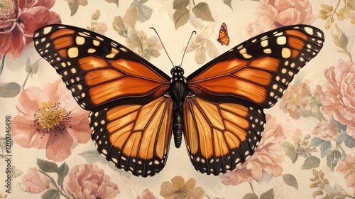 Obraz premium Large monarch butterfly with intricate details on a floral background.