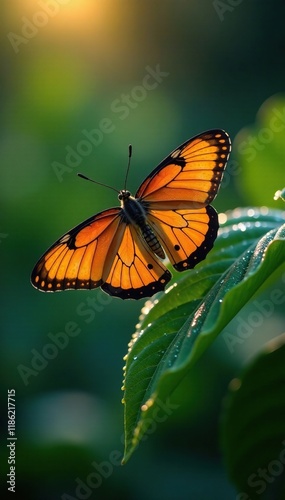 Fototapeta premium Large moth flutters beside a dewy leaf at dusk, shadow, dew
