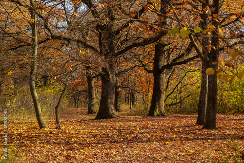 © Na-um, Fototapeta premium Large old oak trees and yellow foliage in sunlight. Fall leaves in park.