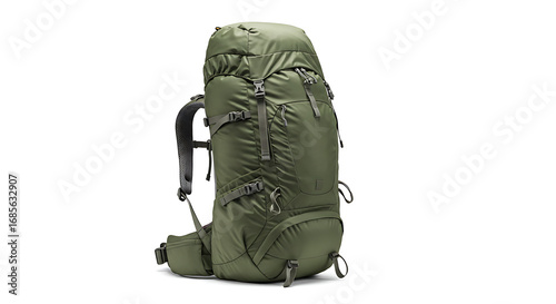 © Sanstive Footage, Naklejka premium Large olive green technical hiking backpack with multiple compression straps and pockets.