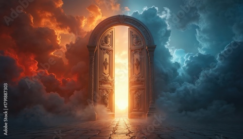 © Pete, Fototapeta premium Large, open double doors with intricate carvings stand between contrasting cloudy skies, judgment transition to afterlife. Doors surrounded by bright, radiant light, representing hope, salvation.