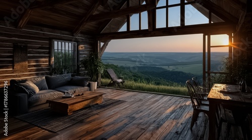 © panumas, Fototapeta premium Large open living room with a wooden floor and a view of the mountains. The room is filled with furniture