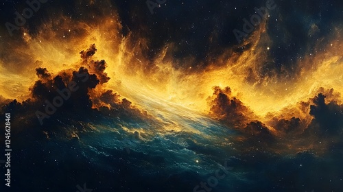 Fototapeta premium Large orange cloud with radiant yellow celestial energy motifs pulsing in the sky