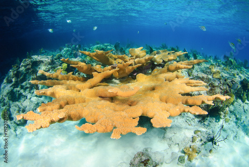Fototapeta premium Large orange elkhorn coral in shallow blue water