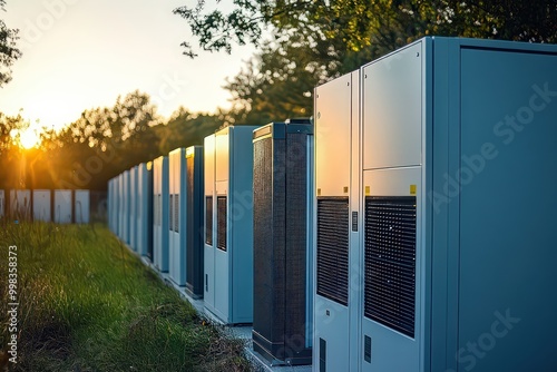 © Lamina, Naklejka premium Large outdoor data servers in a row with a sunset backdrop, representing the importance of modern data storage and digital infrastructure in the technological age.