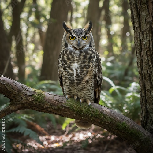 © Wagecs60, Obraz premium Large owl with yellow eyes perched regally on a tree branch