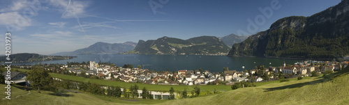 © Andre, Fototapeta premium Large panorama of Swiss mountains and town by the lake of Luzern
