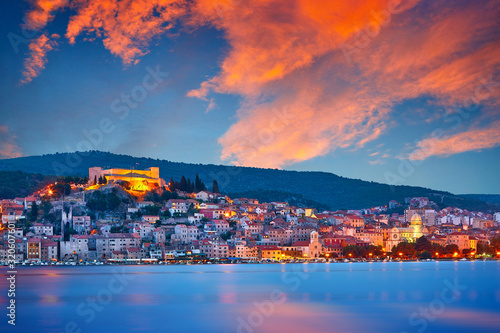 © zicksvift, Fototapeta premium Large panorama of Unesco heritage historic town of Sibenik on Adriatic sea, Dalmatia, Croatia. Shot from the sea, harbor, waterfront and cathedral in front. Dramatic red sky at night..