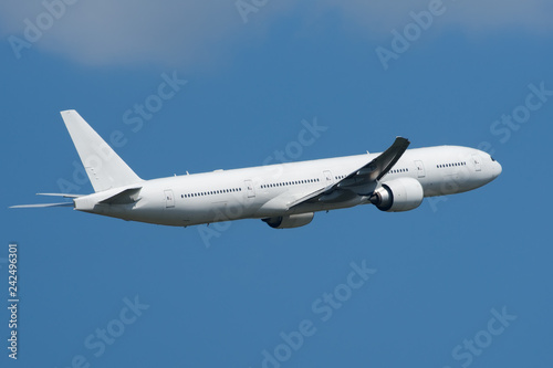 © Media_Works, Obraz premium Large passenger white twin-engine widebody aircraft in the sky