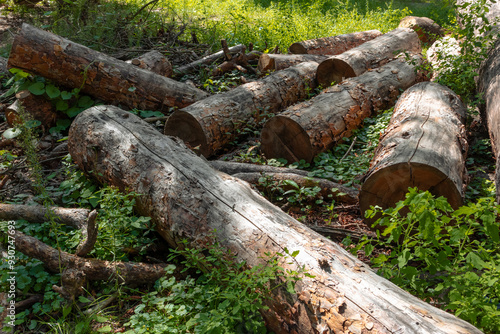 © Klochkov, Fototapeta premium Large pine logs among the grass. Forest destruction for industry