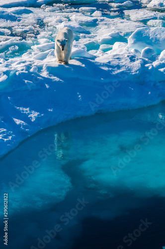 Naklejka premium Large polar bear walking on the ice pack in the Arctic Circle, Barentsoya, Svalbard, Norway