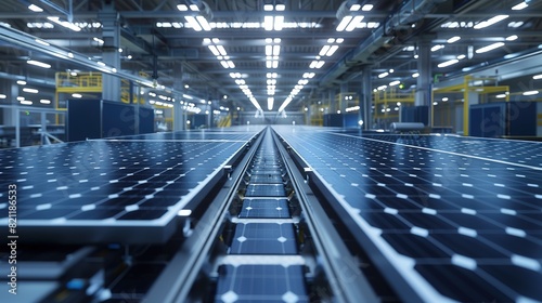 © Adi, Fototapeta premium Large Production Line with Industrial Robot Arms at Modern Bright Factory. Solar Panels are being Assembled on Conveyor. Automated Manufacturing Facility