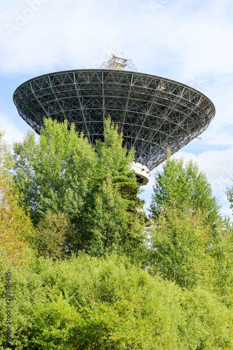 © Sergei Timofeev, Fototapeta premium Large radio telescope antenna against a blue sky in the forest