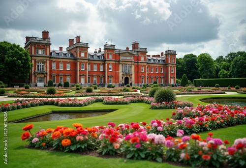 © Viktor, Obraz premium Large red brick palace stands in beautiful gardens. Flowerbeds filled with vibrant colorful flowers. Landscaped green plants surrounds building. Formal gardens display well-maintained lawns, paths.