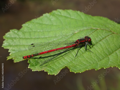 © Distracted_by_Bugs, Fototapeta premium Large red damselfly (Pyrrhosoma nymphula), male resting on a hazel leaf