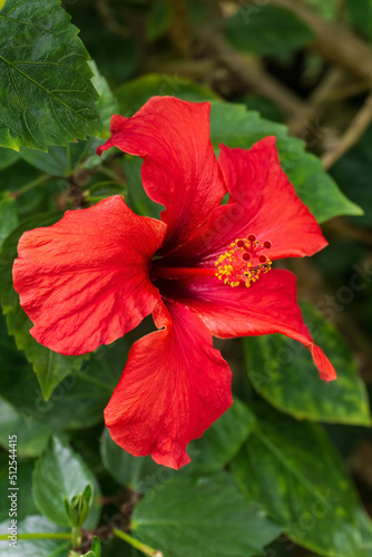 Fototapeta premium Large red hibiscus flower on a bush