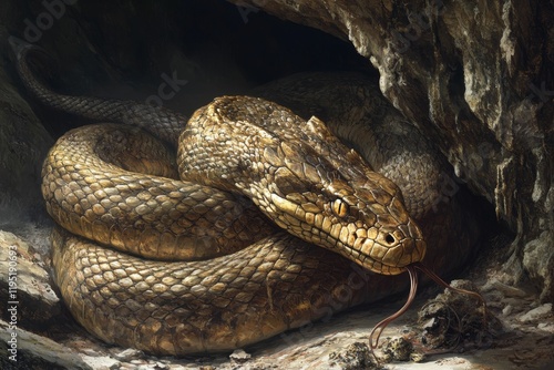 Fototapeta premium Large reptile rests in dark rock cave.