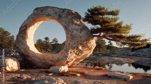 © Ida, Fototapeta premium Large ring-shaped stone, bonsai tree, serene landscape