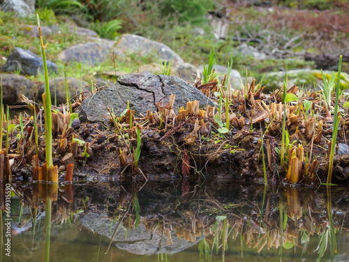 © Dash, Obraz premium Large rock sitting in the middle of a pond with reflection.