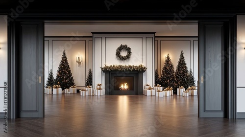 Fototapeta premium Large room features three decorated Christmas trees, a cozy fireplace, and presents arranged elegantly around the festive setting