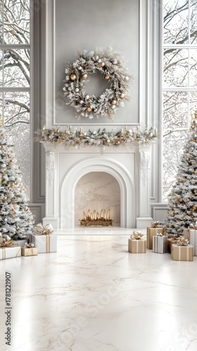 © lililia, Naklejka premium Large room features three decorated Christmas trees, a cozy fireplace, and presents arranged elegantly around the festive setting