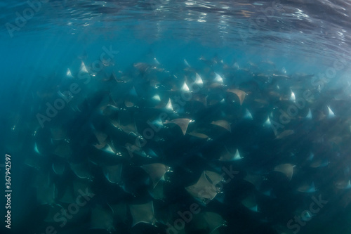© wildestanimal, Fototapeta premium Large school of mobula rays, mobula munkiana, during the annual migration period for these animals, Sea of Cortez, Baja California, Mexico.