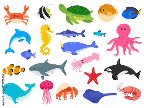 © Rina Design, Naklejka premium Large set of cartoon underwater animals, illustration for children