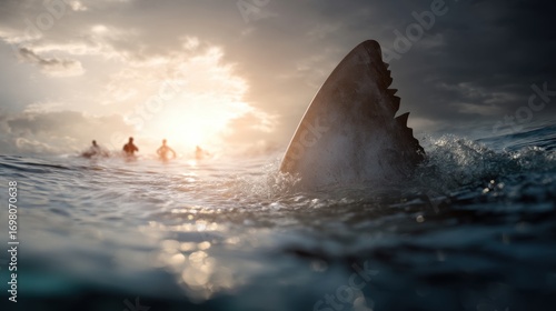 Fototapeta premium Large shark fin in water with silhouette of swimmers at sunset. Concept of danger and threat near people swimming in ocean.