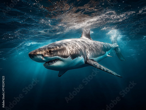 Fototapeta premium large shark swimming underwater, with its body illuminated by light filtering through the water. The setting appears to be deep in the ocean, with dark blue hues dominating the background.