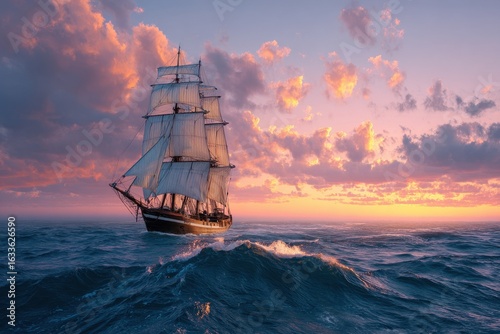 © Pavel, Obraz premium Large ship sails through vibrant ocean waves at sunset, showcasing billowing sails and dramatic clouds in the evening sky