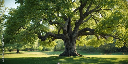© The 2R Artificiality, Naklejka premium Large silver maple in full spring foliage within a park landscape, highlighting seasonal renewal