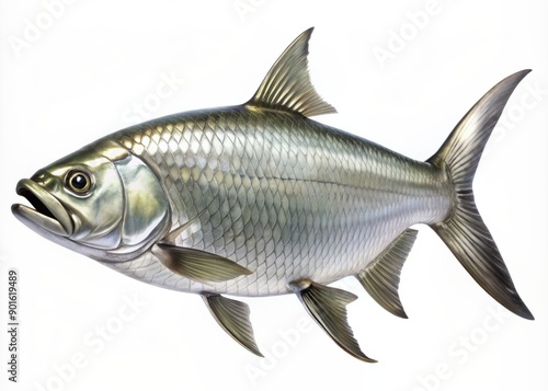 © Caitlin, Fototapeta premium Large silver tarpon fish with shiny scales and distinctive lateral line pattern swims in a curved pose, isolated on a clean white background.