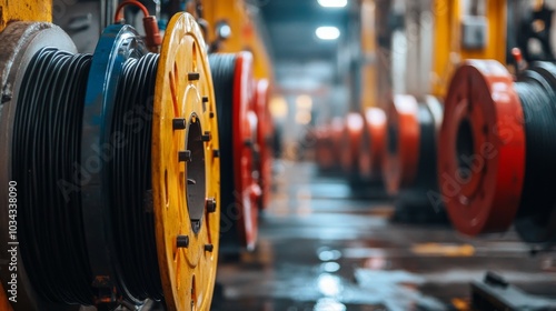 Obraz premium Large spools of electrical wiring are organized neatly within a vibrant industrial environment
