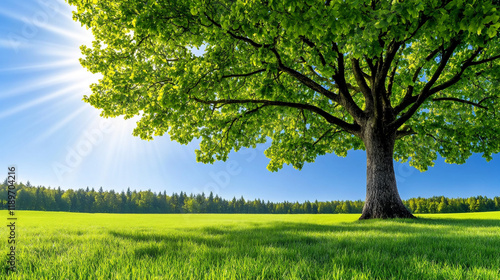 © Anzhela, Fototapeta premium Large Spreading Tree With Lush Green Leaves in a Serene Landscape Embracing Nature's Beauty