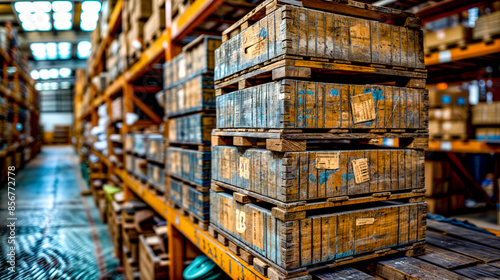 © OLHA, Fototapeta premium Large stack of wooden boxes sitting on top of wooden pallet.