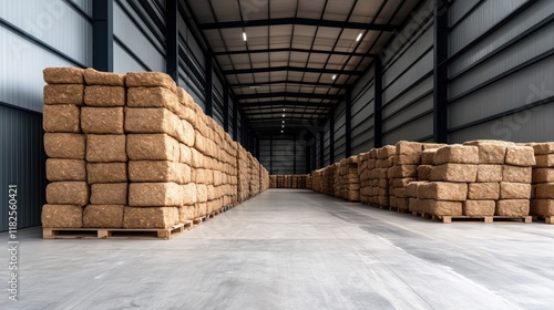 Fototapeta premium Large stacks of hay bales are organized in a well-lit storage facility, with...