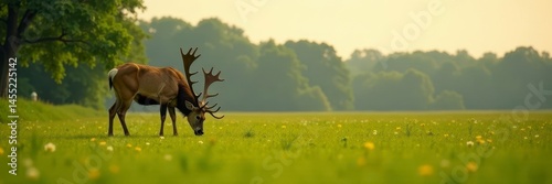 Naklejka premium Large stag grazing peacefully in lush farm pasture , deer, animal, stock photo