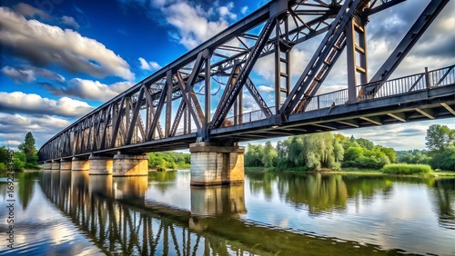 © Shomsu Miah, Obraz premium Large steel railway bridge over a calm river at sunset
