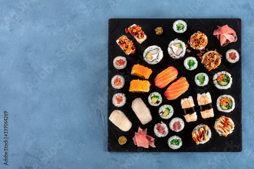 Obraz premium Large sushi set, shot from the top with copy space. Many different maki, nigiri and rolls