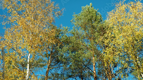 © ogikk, Fototapeta premium large tall trees in the forest against the blue sky and sunset autumn colors