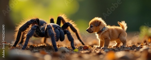 © nittiya, Obraz premium Large tarantula observes small dog cautiously , macro, curiosity