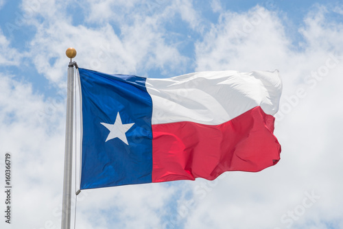 © trongnguyen, Naklejka premium Large Texas (The Lone Star) flag waving on flag pole with cloud blue sky. Windy and sunny day with waving flag blowing/flowing. Ruffled Texas flag. Room for text, copy space.