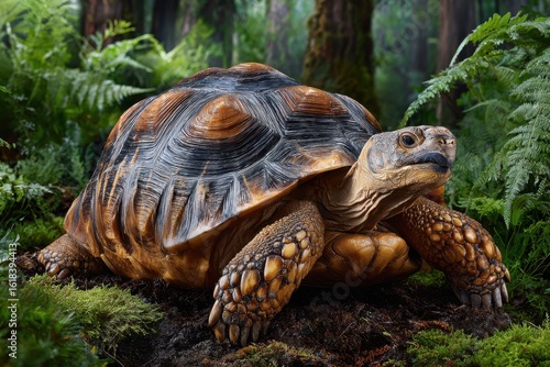Obraz premium Large tortoise crawling on mossy ground in a lush green forest environment...