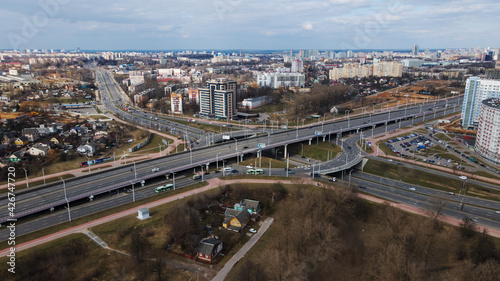 © f2014vad, Fototapeta premium Large transport interchange in a big city. There is a lot of public transport on the road. Aerial photography.